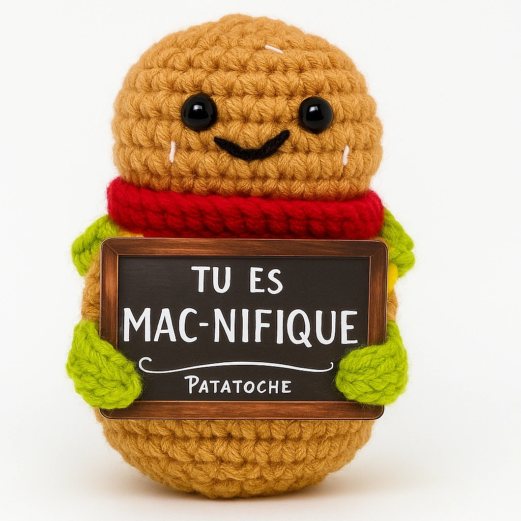 Tout dodu et bien rond, le Burger Patatoche serre sa pancarte comme un trésor : « Tu es mac-nifique ». Avec ses yeux brillants et son pain moelleux, il donne l’impression d’être le copain parfait pour te rappeler à quel point tu comptes.